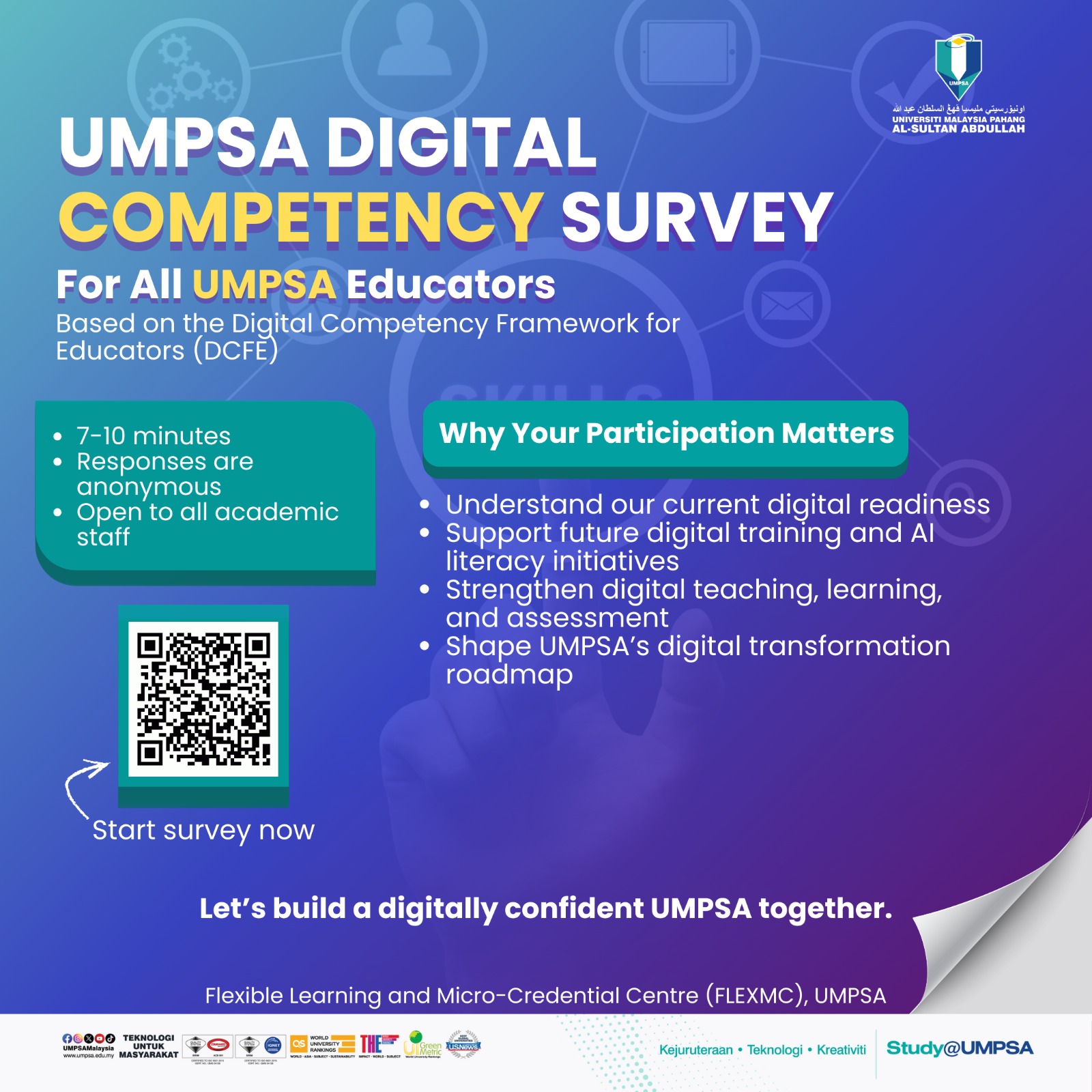 We invite all lecturers to complete the UMPSA Digital Competency Survey for Educators, based on the Digital Competency Framework for Educators (DCFE).